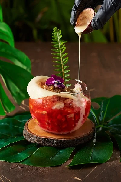 Este es un delicioso plato, inspirado en Guachené y los sabores palenqueños del Cauca. Este está compuesto por una punta de anca bañada en una reducción de lulos chocoanos, borojó y tamarindo, acompañada de un arroz cremoso de chontaduro con champiñones, tomate cherry y chips de yuca.
