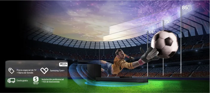 Finalmente, los colombianos que renueven sus TVs con este increíble Combo Agrandando recibirán increíbles descuentos, tales como: Samsung Care+; un seguro por 2 años adicionales a la garantía de 1 año de fabrica, para los nuevos productos con protección completa ante cualquier rotura y avería accidental. Además, recibirán instalación preferencial, kit de bienvenida y el producto será llevado hasta la casa sin costo adicional y, además, suscripción a las plataformas de streaming Prime Video y Win Sports.