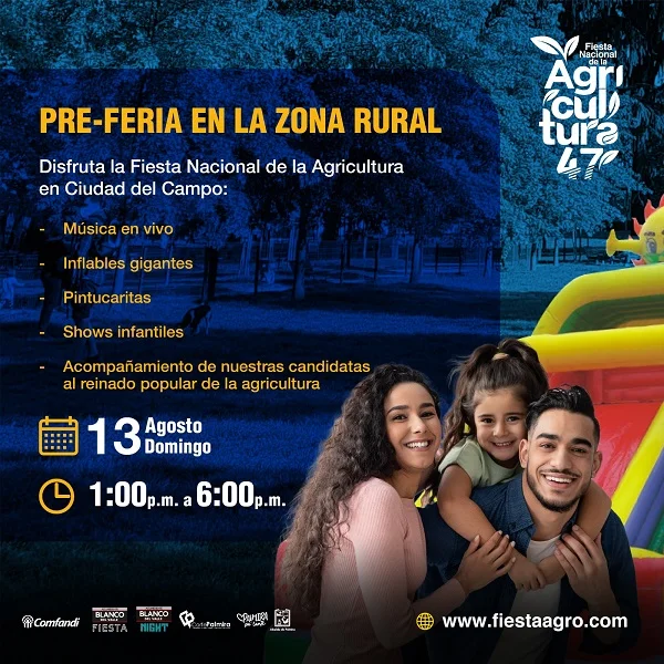 La Fiesta Nacional de la Agricultura en su versión 47 llegará a la zona rural para llevar diversión, entretenimiento y fiesta a los palmiranos de Ciudad del Campo y Palmaseca el fin de semana del 12 al 13 de agosto de manera gratuita.