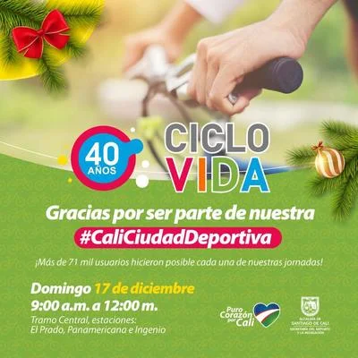 La Ciclovida, Programa de la Secretaría del Deporte y Recreación de la Alcaldía de Cali, se prepara para su última jornada del año el domingo 17 de diciembre en su horario habitual, destacando la importancia de la gratitud y la actividad física para nuestro bienestar integral.