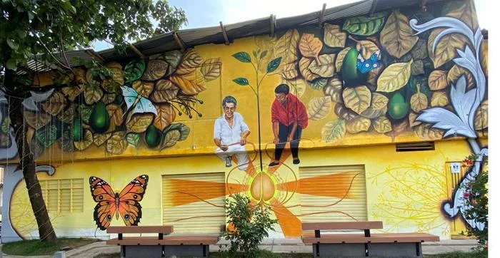 En esta interpretación, el artista plasmó la historia de vida de la familia de doña Elsy Cortés, quienes como muchos en el sector son orgullosos fundadores y hoy habitantes de una de las obras de urbanismo con mayor impacto social en la ciudad.