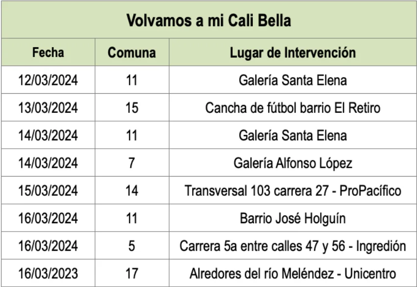 Entre el martes 12 y el sábado 16 de marzo, las intervenciones de la estrategia Volvamos a mi Cali Bella se cumplirán en las comunas 5, 7, 11, 15, 14 y 17 de acuerdo con el siguiente cronograma.