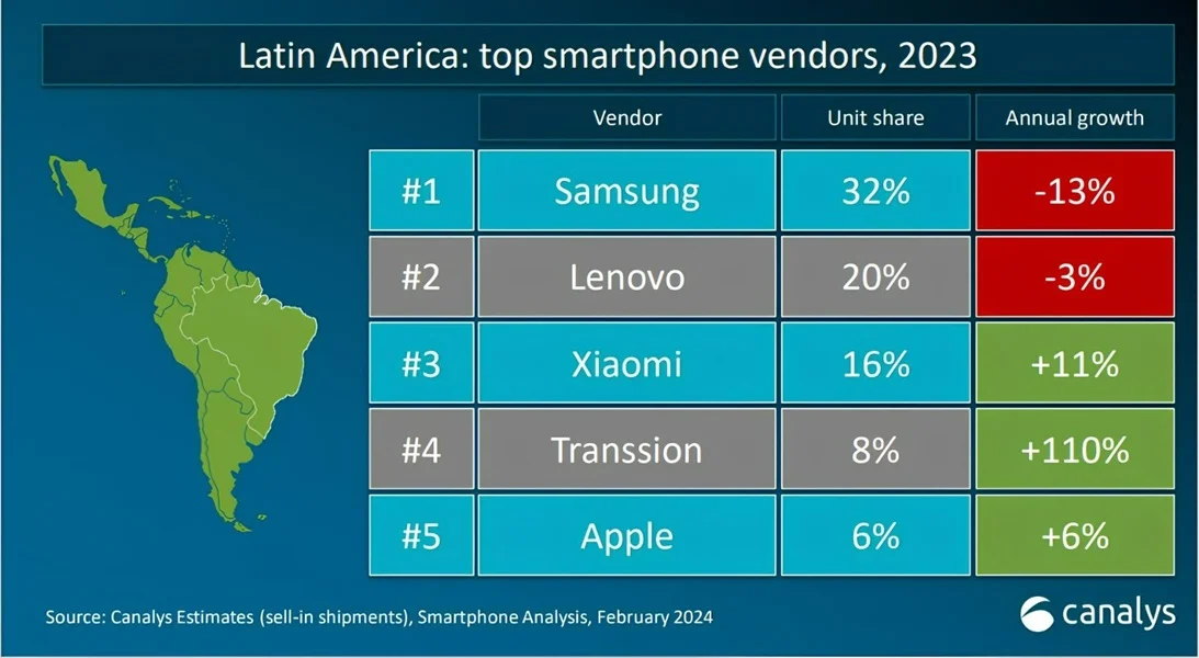 Por tercer año consecutivo, Xiaomi alcanzó el primer lugar en términos de despachos de teléfonos inteligentes en el país durante el 2023. De acuerdo con la firma de análisis del mercado, Canalys, la compañía tecnológica cuenta con una participación del mercado del 30 % en el país, mientras que en latinoamérica se posiciona en la tercera posición con una participación del 16% y un crecimiento anual del 11%.